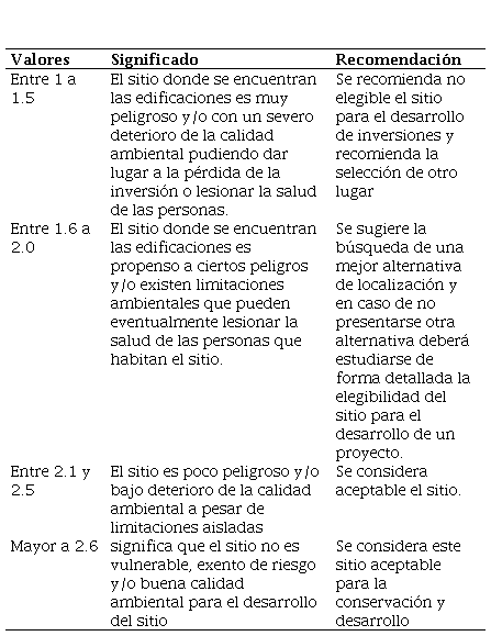 El nivel de vulnerabilidad que tiene el lugar donde están emplazados las edificaciones es de 2.25, lo que significa que el lugar es vulnerable a ciertos peligros, existiendo limitaciones ambientales que pueden perjudicar la salud de los habitantes, razón por lo cual se sugiere un cambio de lugar para vivir; de no ser éste el caso, se recomienda realizar un análisis más a fondo para adaptar el material constructivo a la zona donde se emplaza este proyecto.