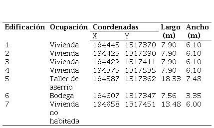 Posteriormente se realizó el levantamiento de las edificaciones a evaluar georreferenciando con un GPS la localización de éstas, así mismo se midió el largo y ancho identificando sus ambientes y utilidad a como se muestra en la Tabla 3.