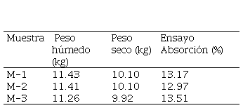 La determinación de absorción de agua en los bloques de adobe suelo cemento comprimido, consistió en someter a los bloques a la inmersión en agua hasta su saturación y luego al secado, para registrar las variaciones en masa de los mismos durante este proceso. Para el cálculo se utilizó la siguiente ecuación:
