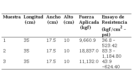 Los resultados de resistencia de comprensión no son similares en las tres muestras, según el MSc. Jean Carlos Gutiérrez Gutiérrez, esto puede ser por la irregularidad en la proporción de la mezcla y que los bloques no reciban la compresión adecuada y el tiempo de curado necesario cuando se están fabricando.