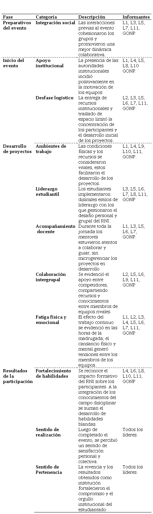El ordenamiento de datos se realizó a partir de matrices en las que se acopió la información. Este proceso develó cuatro categorías (fases) del evento: preparación previa, inicio del Rally, elaboración de proyectos, evaluación y premiación. Luego se realizó un proceso de reducción de datos y análisis de la información para finalmente contraponer los hallazgos (triangulación) desde la perspectiva de sus actores.