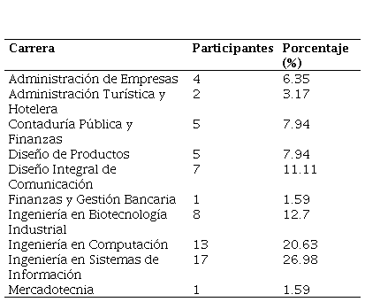 La fase de reclutamiento se completó un día previo al evento con una disímil representación de las áreas del conocimiento dentro de los grupos. En su mayoría, los participantes provenían del área de ciencias básicas y tecnología. En este particular, la tabla 2 presenta el porcentaje de estudiantes según carrera, con una predominancia de estudiantes provenientes de las Ingenierías (60.31%).