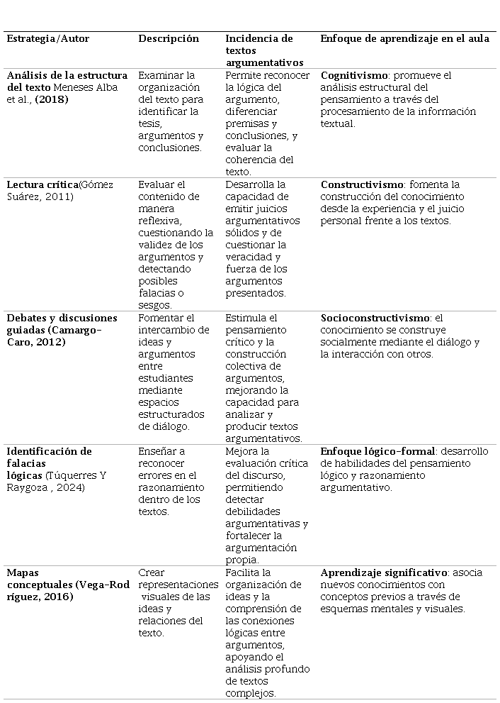La siguiente tabla se elaboró para analizar el impacto de las estrategias de comprensión lectora en la reflexión crítica sobre textos argumentativos. En ella se presentan las cinco estrategias más eficaces, cada una de las cuales se describe en función de su aplicación en el aula y de su repercusión en el desarrollo de los estudiantes en cuanto a las habilidades de análisis, evaluación y construcción de argumentos. Estas estrategias promueven una comprensión más profunda de la estructura de un texto argumentativo, ayudan a identificar las falacias lógicas y fomentan el pensamiento crítico y la participación en debates colaborativos. Por tanto, este enfoque del aprendizaje promueve lectores informados y activos y desarrolla su capacidad para expresar argumentos de forma razonada.