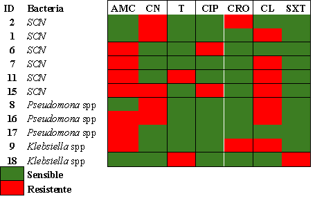 Las cepas de SCN mostraron resistencia contra AMC y CL en cuatro de seis cepas, mientras que para CRO y la T se obtuvo resistencia en una de seis. En el caso de SXT, no se encontró SCN resistentes. Para la CN, se observaron tres de seis resistentes, mientras que en la CIP se obtuvieron dos de seis con resistencia.