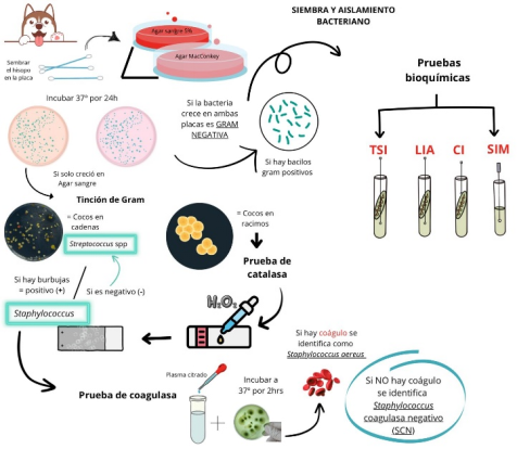 En las bacterias identificadas como Gram positivas se aplicaron las pruebas de catalasa con el fin de diferenciar entre Streptococcus y Staphylococcus. Las que se identificaron como Staphylococcus fueron sometidas a prueba de coagulasa; de obtener un resultado positivo, se clasificaron como Staphylococcus aureus, mientras que las negativas fueron reportadas como Staphylococcus coagulas negativo (SCN). En las bacterias Gram negativa se aplicaron las pruebas bioquímicas de fermenatación Triple azúcar más hierro (TSI, siglas en inglés), Lisina desaminasa (LIA), Citrato de Simmon y Azufre Indol Motilidad (SIM), (Figura 1).