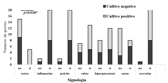 Clínicamente, se observó que la presencia de costra se asoció (p = 0.038) con el resultado del cultivo positivo. Se constató que el 60,0% (9/15) de los perros sin costras generaron cultivos negativos, mientras que el 100% (5/5) de los perros con costras se encontraron con cultivos positivos. Se observó secreción en el 95% (19/20) de los casos, y en un 57,9% (11/19) de ellos se obtuvo un resultado positivo en el cultivo; así mismo, el perro que no presentó secreciones fue negativo en el cultivo.