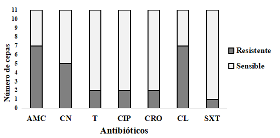 Sobre el perfil de resistencia antimicrobiana de las cepas bacterianas aisladas, se encontró que 63,7% (7/11) de las cepas fueron resistentes a la AMC y CL, mientras que a la CN se observó resistencia en un 45,5% (5/11) de los aislamientos. Respecto a la T, CIP y CRO se obtuvo que el 18,2% (2/11) de cepas fueron resistentes a estos antibióticos. Finalmente, SXT no fue efectiva en 9,1% (1/11) de las cepas encontradas, (Figura 3).