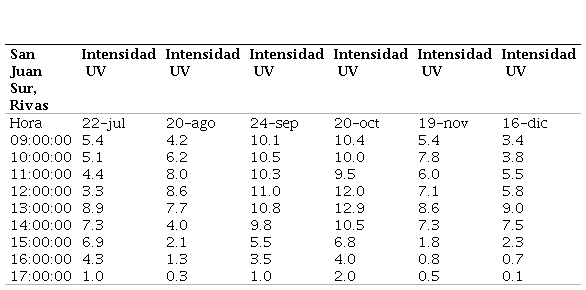 Los resultados del estudio arrojan que la radiación UV de mayor intensidad se presenta a las 1:00 p.m., con un índice máximo de 12.9. Algunos valores caen a esta hora por la nubosidad de la temporada lluviosa en Nicaragua. Al mismo tiempo, los meses de mayor índice UV fueron septiembre y octubre; esto es anormal porque en este año persistió la influencia del fenómeno climático La Niña, ocasionando que octubre, históricamente el mes más nublado y lluvioso, presentara días despejados. En contraste, el mes de septiembre presentó las mañanas de mayor promedio de índice de UV con un valor de 10.3 con respecto a los meses medidos.