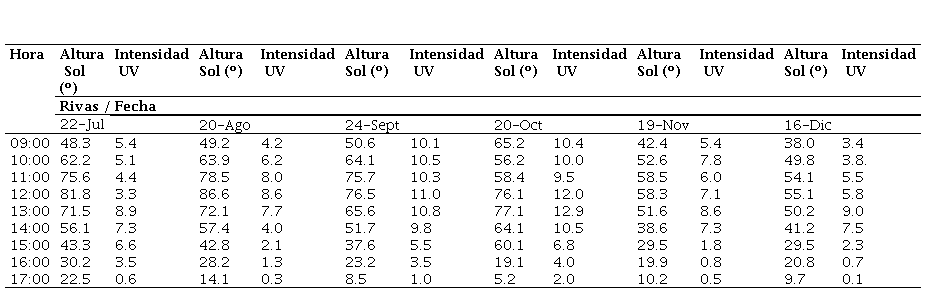 En la Tabla 3, se presentan los datos de la hora, la altura del Sol y la intensidad de la radiación UV medidos in situ en la bahía de San Juan del Sur. La columna 1 representa la hora, las columnas 2, 4, 6, 8, 10 y 12 corresponde a la altura y fecha de medición; en las columnas 3, 5, 7, 9, 11 y 13 corresponden las intensidades de radiación UV obtenidos.