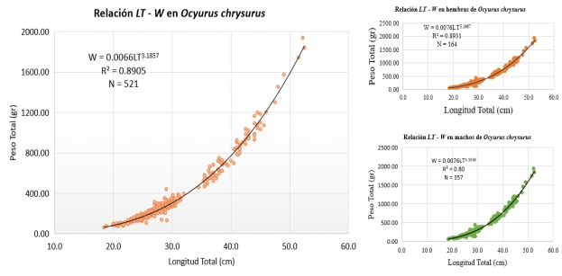 El resultado de esta relación es un modelo exponencial que explica en 89 % la relación entre las variables de LT y W. De manera general, la especie presenta un crecimiento alométrico positivo, es decir, a mayor longitud, mayor peso del individuo. Este mismo modelo en los machos solo explica el 80 %, mientras que en las hembras el modelo explica el 89.3 % de la relación entre las variables de LT y W. Es decir, las hembras crecen más isométricamente, mientras los machos crecen más en longitud que en peso.