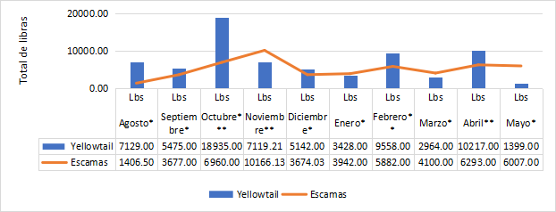 Los mayores desembarques registrados para el yellowtail fueron en octubre 2023 y abril 2024 con un poco más de 26% y 14% respectivamente. El mes de menor acopio fue mayo 2024 con un poco menos del 2% del total acopiado por la empresa NICATILAPIA S.A. Para el resto de productos acopiados (escamas), noviembre 2023 fue el mes de mayor captura, y el de menor captura fue agosto 2023 con un poco más de 19% y un poco menos del 3% del total acopiado por la empresa.