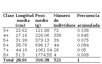 Se logró identificar seis clases de edades. Las clases 3+ y 4+ representan más del 78 % de las capturas totales; es decir, individuos juveniles menores de 27.16 cm de longitud promedio. El resultado de la relación entre LT y W es un modelo exponencial (W= a LT b) que explica el crecimiento alométrico positivo, que en los machos explica el 80 % y en las hembras el 89.3 % de relación.