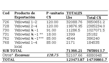 Las capturas acopiadas por la empresa NICATILAPIA S.A del yellowtail snapper en la embarcación Nisy Katiusca representó 57.8 % del desembarque. El resto de productos escamas sumaron 42.2 % de las capturas totales de la embarcación en los 10 meses de faenas de pesca realizados. El código 726 (yellowtail 1-2) y 728 (yellowtail 2-4) fueron las tallas de mayor captura, con 26 % y 16 % del total de los ingresos generados, mientras que el código 731 (yellowtail ¾-1 2da) y 768 (yellowtail 1-4 local) generaron ingresos menores al 2 % del total acopiado por la empresa.