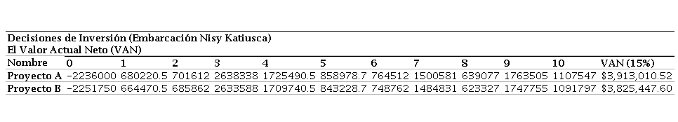 El resultado del valor actualizado de los cobros y pagos futuros de la inversión a la tasa de descuento elegida (tasa con la cual trabaja toda entidad bancaria) genera beneficios en ambos proyectos, teniendo como gastos operativos fijos C$ 236,000.00 por jornada de pesca.