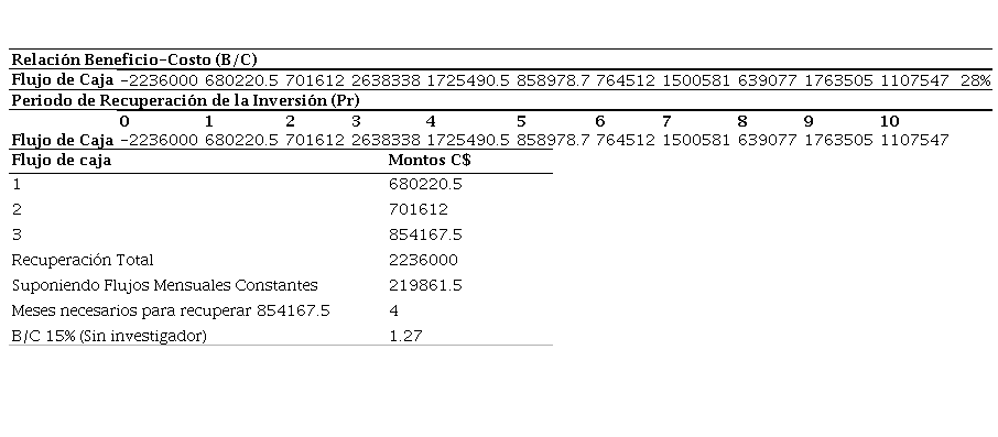 Haciendo los flujos de cajas respectivos, podemos observar que el capital invertido se recupera a los 4 meses para ambos escenarios, y el índice B/C es mayor a 1; es decir, por cada córdoba que se invierta en el proyecto se obtendrá una ganancia de 27 centavos sin investigador y 21 centavos con investigador.