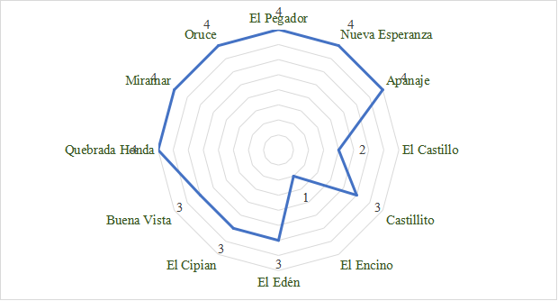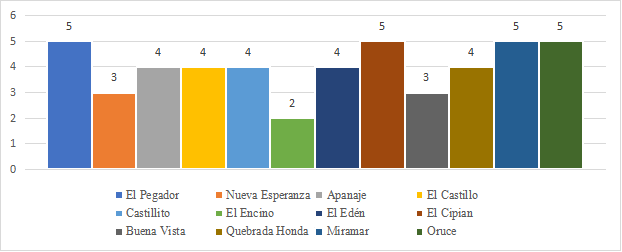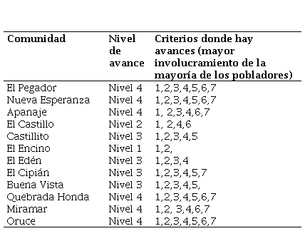 Las comunidades mejor posicionadas en la metodología Comunidades Verdes y, por ende, con mejor puntaje en el alcance de los niveles, son: El Pegador, Nueva Esperanza, Apanaje, Quebrada Honda, Miramar y Oruce. Las comunidades en nivel intermedio, es decir, con puntaje en el nivel 3, son: El Castillito, El Edén, Cipián y Buena Vista; y el territorio posicionado en nivel 1 es el Encino, correspondiente al nivel más bajo.