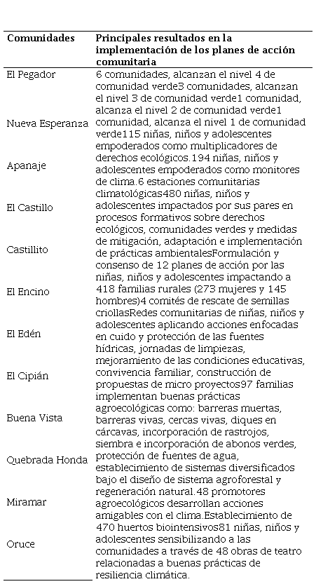 Al mismo tiempo, esta metodología, acompañada de las buenas prácticas de resiliencia climática: multiplicación de par a par, planes de acción comunitaria, red de niñas, niños y adolescentes ecologistas, red de monitores de clima, comités comunitarios de semilla, huertos biointensivos y teatro popular, es catalogada como exitosa para el desarrollo ambiental comunitario, el cual evidencia el fortalecimiento del tejido social, la expansión del diálogo intergeneracional, la articulación de acciones en beneficio del clima, la multiplicación de saberes ecológicos y, sobre todo, la reivindicación de los derechos de la niñez y la adolescencia en el plano ambiental.