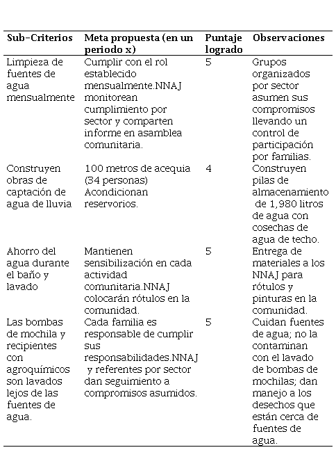 · Gestión de agua: Promoviendo acciones individuales y colectivas para la protección y conservación del agua en las comunidades (pozos, ojos de agua, lagunas, ríos y quebradas), a fin de aminorar los efectos generados por la escasez de agua y su incremento por efecto del cambio climático (Chávez Jiménez, 2012).