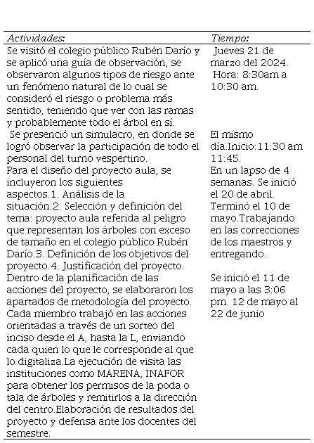 Abstract: This report-style article arose from a school diagnostic study conducted as part of the V Integrative Component of the Natural Sciences program at UNAN-Managua/CUR-Matagalpa, as a final course project. The study aimed to identify vulnerabilities at the Rubén Darío school, highlighting the need to address the danger posed by large trees. The data collection consisted of an observation guide and argumentative matrix to prioritize the problem and propose a classroom project as a solution. The purpose was to ensure compliance with the school safety plan mandated by the Ministry of Education (MINED) for educational activities, demonstrating commitment to the environment, ecological balance, and the protection of human life. The study identified that Guanacaste, Cenízaro, and Madroño trees were posing a danger, as they were in areas central to pavilions and classrooms, since their age and morphology presented a threat to school safety, with potential risks including falling branches onto roofs, lightning strikes, and cracks in walls due to exposed roots. Performing careful maintenance with specialists ensures proper and sustainable management of oversized trees, therefore, a project was designed to evaluate the potential dangers of said trees and obtain authorization grants from pertinent institutions for their pruning and cutting, assessing the risks and caring for the trees, while preserving the environment. In addition, periodic evaluation of the trees was conducted, thereby reducing associated risks, and enabling the activation of school emergency response teams.