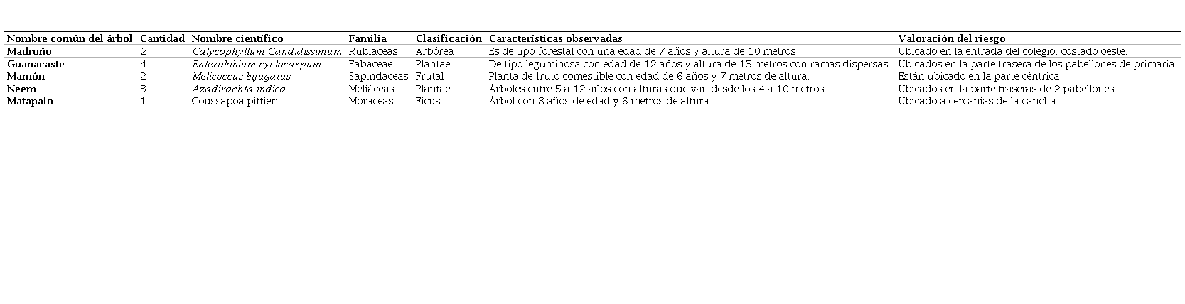 De acuerdo al estudio del diagnóstico y ejecución del proyecto aula, se encontró una variedad de árboles, entre ellos, Guanacaste y mamón, los cuales se exceden en tamaño. Se logró identificar que hay aproximadamente 12 árboles que tienen una altura media de 10 - 15 metros en puntos peligrosos para la población estudiantil. Entre ellos se destacan: