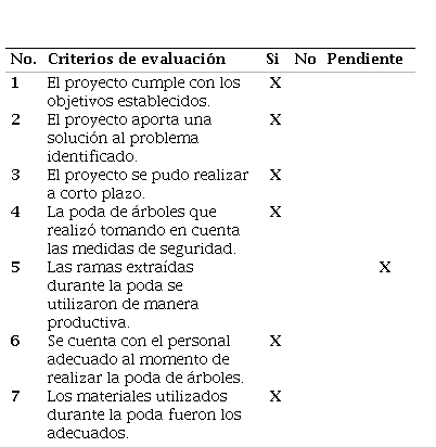 La tabla anterior muestra la evaluación realizada al final del proyecto, los aspectos marcados con si denotan el cumplimiento de los objetivos propuestos, así como la solución significativa a la problemática, lográndose ejecutar durante el I semestre 2024, quedando algunos aspectos pendientes como la reutilización de la madera extraída, tomando todas las medidas de precaución.