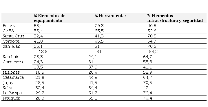 Si observamos la subdimensión “instrumentos y herramientas” es, nuevamente, la escuela de la Provincia de Buenos Aires la que mayor porcentaje tiene (el 79,3%) seguida por CABA y Córdoba (ambas con un 65,5%), Neuquén (un 55,1%) y La Pampa con el 51,7%. Como consolidándose un patrón, es la escuela de la provincia de Misiones la que menor porcentaje posee (20,6%).