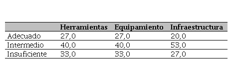 De este modo, para la subdimensión “herramientas e instrumentos” se estableció una clasificación tripartita: insuficiente (para aquellas escuelas que poseen entre 0 y el 35% de elementos del DAEF presentes en sus instituciones), intermedia (para aquellas que poseen entre el 35 y el 55% de los elementos), y adecuado para las escuelas que cuentan con más del 55% de los elementos.