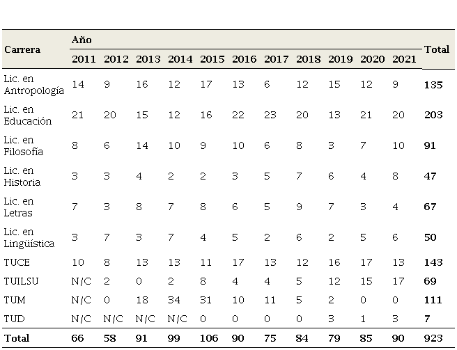 Entre 2011 y 2021 hubo 923 egresos de grado en la FHCE, de los cuales el 64% corresponden a licenciaturas y el 36% a las tecnicaturas. A continuación, se presenta el total de egresos en cada año (Figura 1) y desagregados por año y carrera (Tabla 1).