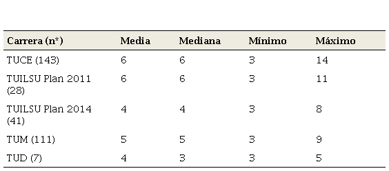TUCE = Tecnicatura Universitaria en Corrección de Estilo, TUILSU = Tecnicatura Universitaria en Interpretación y traducción de Lengua de Señas Uruguaya, TUM = Tecnicatura Universitaria en Museología, TUD = Tecnicatura Uruguaya en Dramaturgia