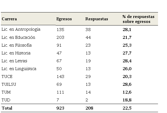 En el ámbito de las ciencias humanas en Uruguay el vínculo entre el egreso universitario con el ingreso al campo laboral resulta difuso. En primer lugar, por las características del estudiantado que predominantemente se encuentran ocupados previo al egreso o son pasivos; y, en segundo lugar, porque existe un desconocimiento generalizado de las especificidades de formación que los egresados poseen (Abbadie et al., 2018).