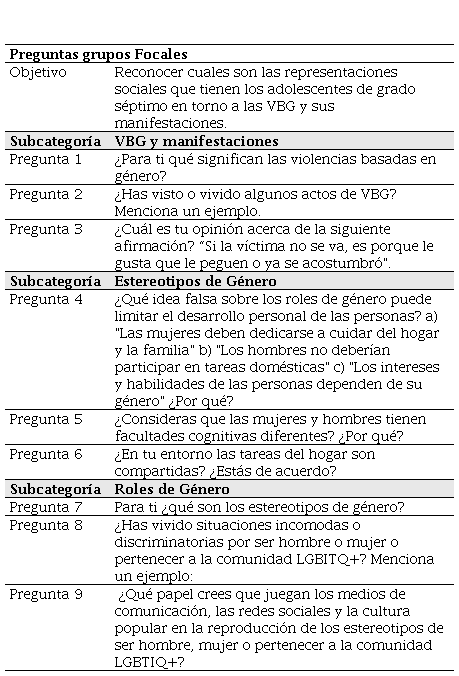 Para el desarrollo del primer grupo focal se realizaron 9 preguntas que atienden igualmente a la categoría de VBG, y a sus subcategorías. A continuación, se anexan las preguntas en la tabla y se presenta una figura que sintetiza los resultados más importantes.
