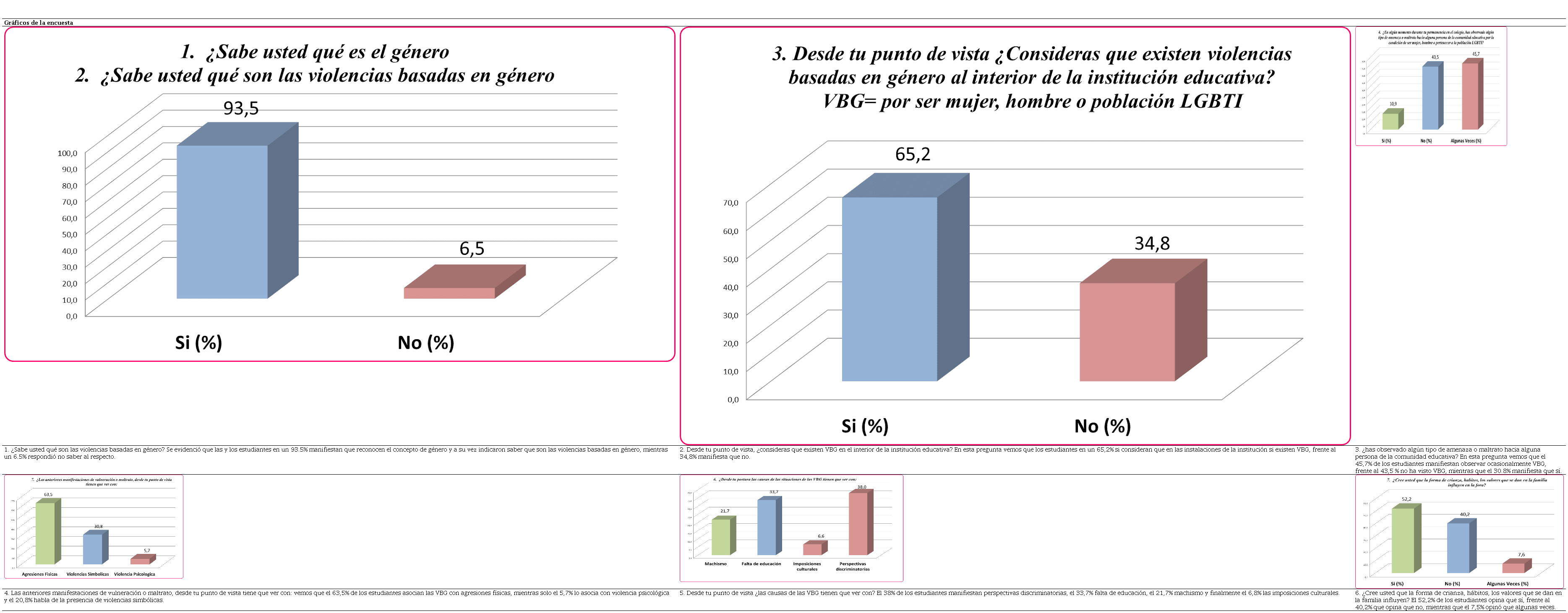 Partiendo del objetivo general de la investigación, desarrollar una estrategia pedagógica para la prevención de las violencias basadas en género desde los pilares de la pedagogía crítica, podemos afirmar que los resultados mostraron la necesidad de aplicar la estrategia pedagógica, pues la encuesta arrojó prácticas de VBG en la institución educativa, particularmente de violencias simbólicas que han sido normalizadas a partir de la acción de agentes socializadores.