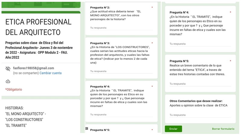 En una de las clases observadas se abordó el rol profesional del arquitecto y la ética en su desempeño, temas que el docente ha desarrollado utilizando una metodología basada en títeres, actividades interactivas, incorporando cuestionarios en línea (Google Forms) para recoger las respuestas de los estudiantes (figura 2).