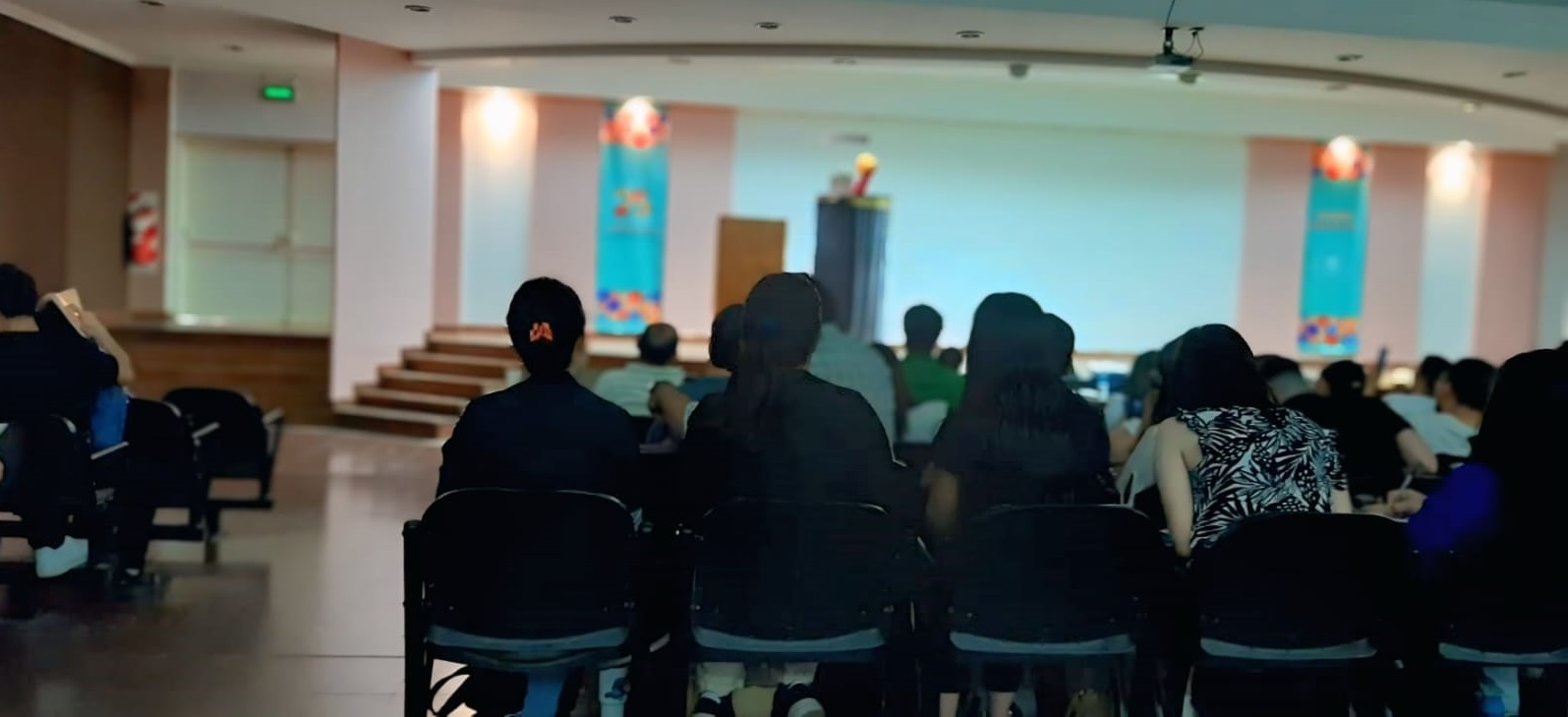 Igualmente, enfatiza el vínculo emocional y el reconocimiento de los estudiantes, quienes valoran su esfuerzo por integrar contenidos artísticos, prácticos y teóricos. Reflexiona sobre cómo su práctica docente ha evolucionado a lo largo de los años, ajustándose a las necesidades cambiantes de los alumnos, especialmente tras la pandemia. A través de herramientas como formularios digitales y debates en grupo, permanentemente intenta motivar y alentar a los estudiantes a asumir un rol activo en su formación profesional. Concluye que el aprendizaje no solo depende de los contenidos, sino de cómo estos generan un impacto en la recepción y desarrollo personal de los alumnos. En la siguiente figura se muestra el auditorio de estudiantes presenciando el momento de la obra.