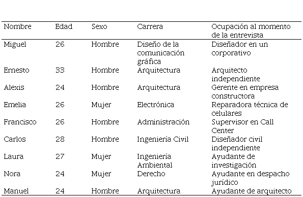 Para esta investigación, aplicamos una serie de entrevistas semiestructuradas para reconstruir las historias laborales de un grupo de estudiantes de la Universidad Autónoma Metropolitana Azcapotzalco (UAM-A) que trabajaron en empleos relacionados a su carrera. Es importante destacar que previo a la aplicación de dichos instrumentos, se obtuvo el consentimiento informado de todos los estudiantes trabajadores participantes, con el cual se garantizó el respeto por sus derechos y privacidad. En total, se recolectaron un total de nueve entrevistas (ver tabla 1), seleccionando a los informantes bajo los siguientes criterios: 1) hombres y mujeres estudiantes inscritos en cualquier licenciatura en la UAM-A, y 2) estar desempeñando una actividad laboral relacionada a su carrera al transitar por la universidad.