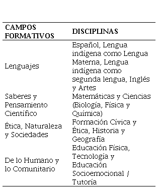 En la tabla 1, se muestran los campos formativos propuestos por la Nueva Escuela Mexicana y su relación con las asignaturas y/o disciplinas.