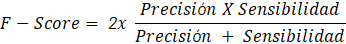 La Puntuación F1 (F1 Score), hace referencia a la media armónica entre la precisión y la sensibilidad. Esta métrica proporciona un equilibrio entre ambas, lo cual es útil cuando es necesario equilibrar el impacto de los falsos positivos y falsos negativos.