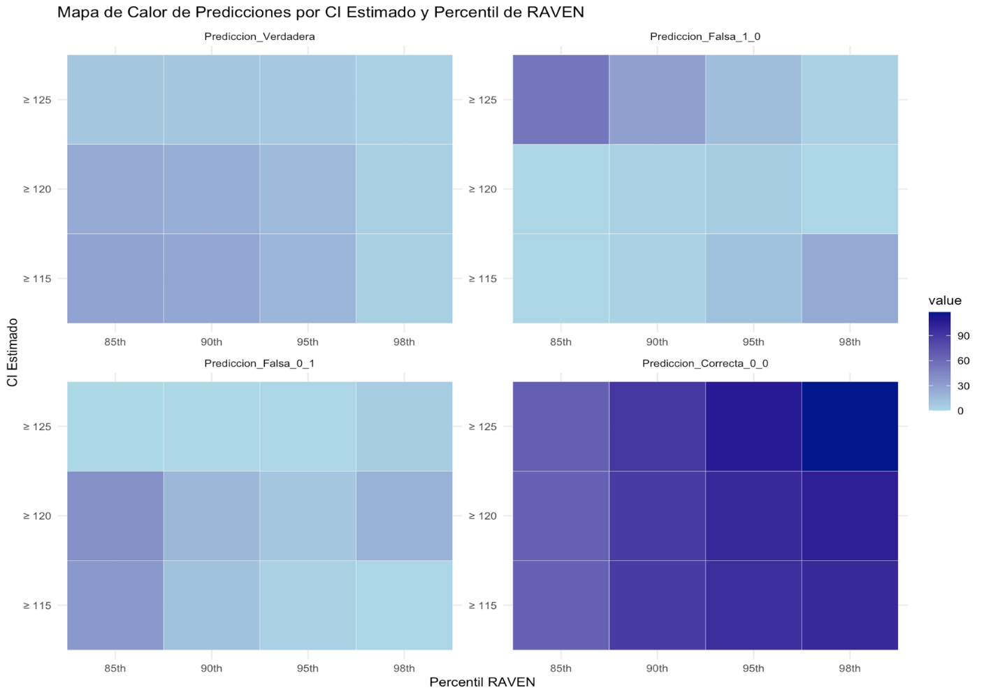 Cuando consideramos el CI estimado de ≥ 115, encontramos que el percentil 90 del RAVEN ofrece el mejor balance de métricas de eficiencia diagnóstica, incluyendo alta exactitud, precisión y F1 Score, lo que lo convierte en un indicador confiable para identificar a estudiantes con un CI estimado de ≥ 115. El percentil 85, aunque con alta sensibilidad, puede llevar a un número significativo de falsos positivos, afectando la precisión del proceso de identificación. En cambio, el percentil 95 ofrece mayor precisión, pero a costa de perder a algunos estudiantes AS, lo que indica una menor sensibilidad.