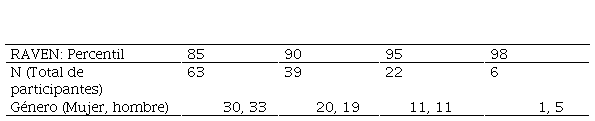Diversos estudios emplean el percentil 90 o superior en esta prueba como punto de corte para identificar a estudiantes AS (Rodríguez Cervantes et al., 2022). Un ejemplo de ello es el estudio realizado en Lima, Perú, por Navarro-Saldaña et al. (2022), que evaluó a 650 niños (51.53% mujeres y 47.84% hombres, con un rango de edades entre 11 y 17 años) utilizando el RAVEN para la detección de estudiantes AS. Los autores lograron identificar a 97 estudiantes, lo que representa el 14.2% de la muestra, demostrando así la efectividad del RAVEN en la identificación de estudiantes AS en esa población. Sin embargo, la alta tasa de detección pudiera mostrar la sobrestimación de alumnos AS.