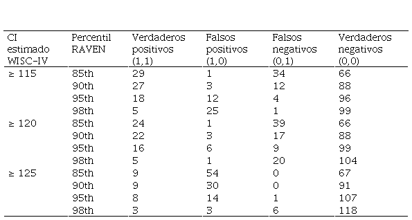 La precisión diagnóstica se evaluó mediante estadísticas de eficiencia diagnóstica. Para el test RAVEN, se utilizaron puntos de corte en los percentiles 85, 90, 95 y 98 para toda la muestra, basados en los percentiles obtenidos de un estudio de validación con población mexicana (en preparación), considerando las normas por edad. Además, se emplearon puntuaciones de CI estimado de la versión mexicana del WISC-IV, con puntos de corte en 115, 120, 125 y 130.