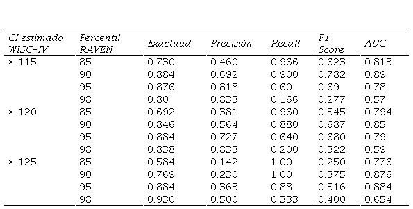 Es importante mencionar que ningún estudiante de nuestra muestra logró el punto de corte de CI estimado del WISC-IV de ≥130, por lo que los valores cero (0) en las métricas corresponden a esta categoría. Limitando el análisis de prueba de eficiencia para este umbral de CI estimado.