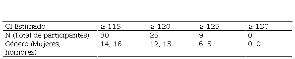 Para determinar el Gold Standard, de la muestra de 130 participantes, se seleccionó un subgrupo de 30 participantes, que obtuvieron un puntaje de CI estimado ≥ 115 en la versión mexicana del WISC-IV (Wechsler, 2007), utilizando una versión abreviada y siguiendo el procedimiento de CI estimado descrito por Sattler (2009). Las y los participantes fueron agrupados según su CI estimado en cuatro rangos (≥ 115, ≥ 120, ≥ 125, ≥ 130, ver Tabla 1). Es importante mencionar que estos subgrupos no son excluyentes, lo que significa que las y los participantes con puntajes de CI más altos están incluidos en todos los subgrupos inferiores. Por ejemplo, una o un participante con un CI de 128 se clasificaría en los subgrupos de CI estimado ≥ 115, CI ≥ 120 y CI ≥ 125. Cabe destacar que ningún participante alcanzó un CI estimado de ≥ 130.