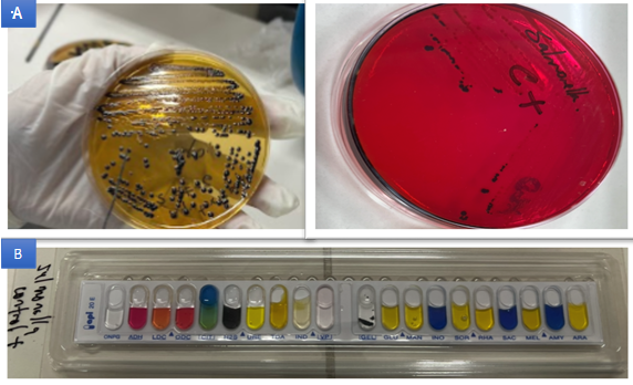 Nota. A. Colonias de ATCC 14028 Salmonella entérica subsp. entérica serovar typhimurium en agar Salmonella - Shigella y Agar XLD; B. Prueba bioquímica API20E® de ATCC 14028 Salmonella entérica subsp. entérica serovar typhimurium.