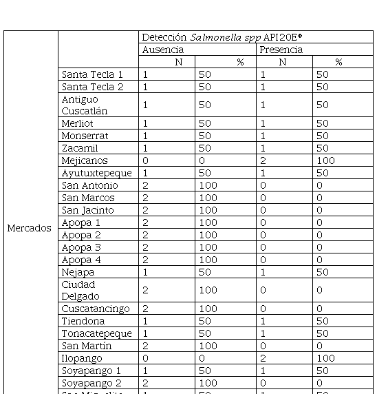 En la tabla 1 se detallan los porcentajes de positividad en cada uno de los 25 mercados, se puede observar que 2 de los mercados mostraron positividad a Salmonella spp, en ambos puestos analizados (8 %), correspondientes a los departamentos de Mejicanos e Ilopango, apareciendo en 12, al menos uno de los puestos mostró positividad (48 %) y el resto resultó negativo (44 %).