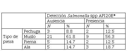 El estudio también permitió determinar la categoría de pieza donde se encontró el microorganismo en mayor porcentaje, obteniendo como resultado que el tipo de pieza muslo, representó el 56.3 % del total, mientras que en las categorías de pechuga y pierna se encontró un menor porcentaje reflejado con el 12.5 % de positividad.