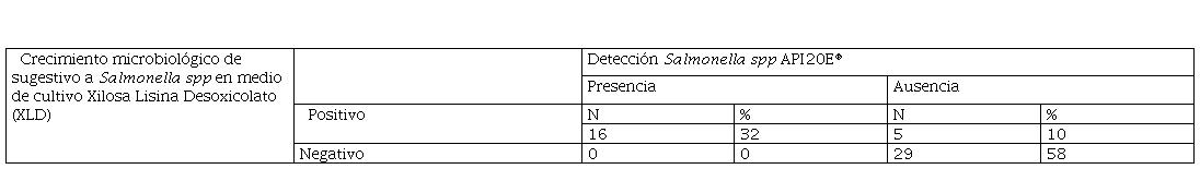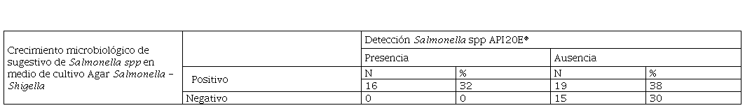 Durante el diagnóstico, se observaron las características microbiológicas correspondientes al aislamiento de Salmonella spp en las muestras analizadas para cada uno de los mercados en estudio. Aquellos casos en que se evidenció crecimiento de colonias sugestivas de Salmonella spp en medio Agar Salmonella-Shigella, fueron confirmados por medio de pruebas bioquímicas API 20E®, dando como resultado que 16 muestras con crecimiento sugestivo fueron confirmadas por pruebas bioquímicas (32 %), mientras que 19 muestras con crecimiento sugestivo fueron negativas a la confirmación del microorganismo por el método bioquímico (38 %). (Ver tabla 3)