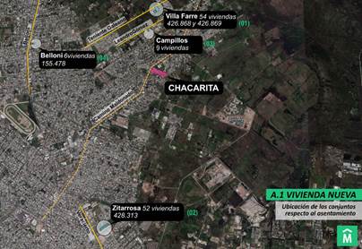El realojo parcial de La Chacarita, que incluía la primera decisión, financiamiento, planificación y supervisión del proceso, llevó varios años desde su primer censo en 2017 hasta su cuarto grupo de realojo en 2023. Para la relocalización permanente de La Chacarita, el 57% fue realojado mientras que el resto teóricamente permanecería con un plan de mejoramiento dirigido a los déficits de vivienda más urgentes. Las modalidades de realojo variaron desde la relocalización comunitaria a bloques de viviendas de nueva construcción hasta el realojo individual a través de un programa subsidiado. Este último, el Programa de Compra de Vivienda Usada (PCVU), representó una alternativa de realojo individual para 20 familias que buscaron una casa en el mercado por sí mismas. En la práctica, no solo los posibles inmuebles, sino también los contendientes subsidiados debían cumplir muchos criterios, como condiciones laborales formales, un salario mínimo, seguridad social, saneamiento intacto, sin humedad, etc.[3]. Debido a estos requisitos, la mayoría de los residentes fue excluida de esta opción individual en La Chacarita, lo que llevó a que el 93% participara en la relocalización comunitaria. En consecuencia, fueron divididos de nuevo espacial y temporalmente en cuatro grupos: 52 familias que se mudaron a Zitarrosa en diciembre de 2021, 54 familias a Villa Farre en agosto de 2022, seis familias a Belloni en diciembre de 2022 y nueve familias a Campillos en marzo de 2023 (ver Figura N°1).