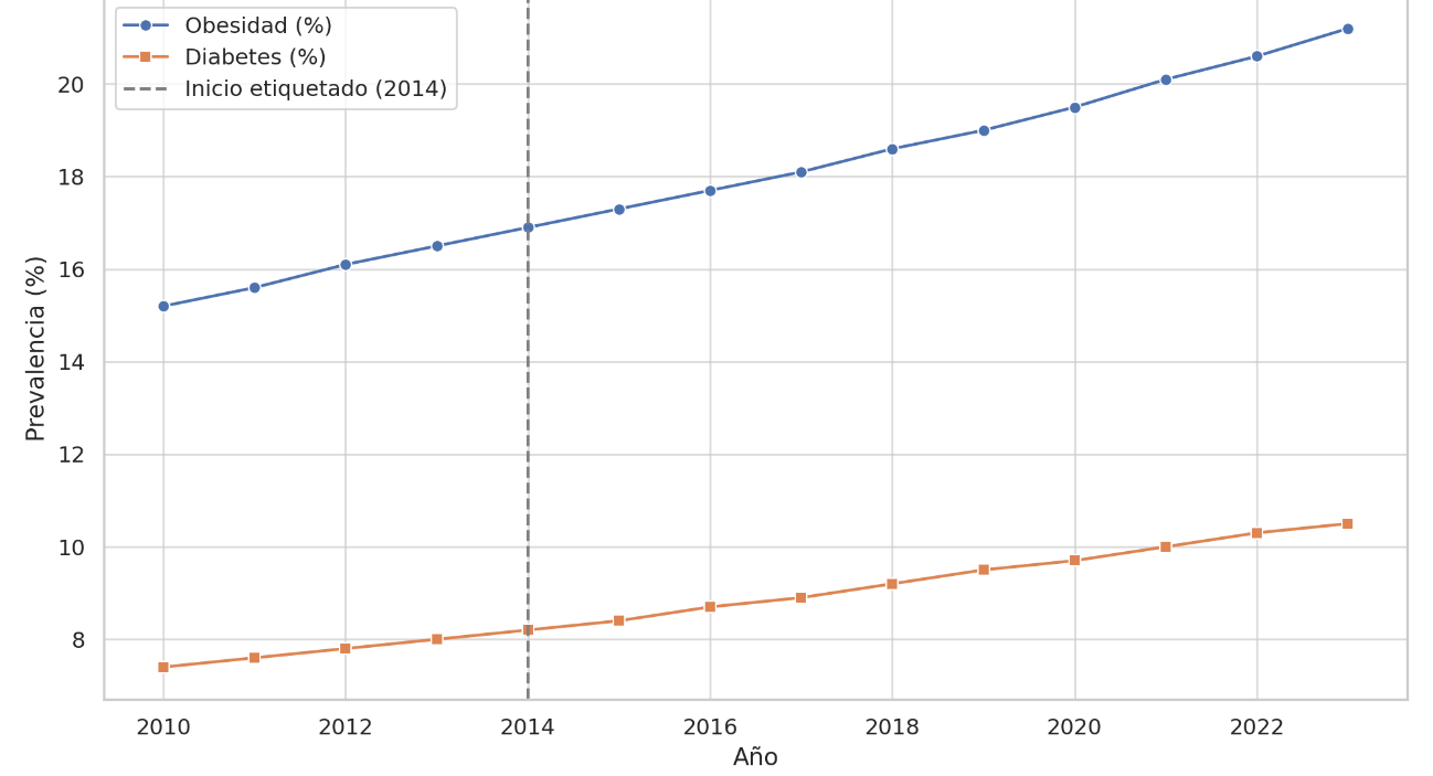 A pesar de la implementación del etiquetado nutricional, los indicadores muestran un aumento en la prevalencia de obesidad como en diabetes. Estas tendencias demuestran que el etiquetado, como herramienta aislada, no logra modificar comportamientos de consumo en la población. Lejos de atribuir estos resultados a supuestas fallas individuales, la persistencia de estas cifras señala la influencia decisiva de factores estructurales del sistema, como el precio de los alimentos saludables, la oferta desigual por estrato socioeconómico y la presión publicitaria de la industria.