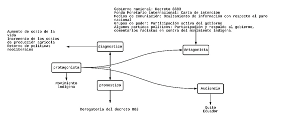 En esta etapa, los marcos interpretativos fueron elaborados tanto por el Gobierno como por los representantes del Movimiento Indígena, cada uno desde narrativas y perspectivas distintas. En la cobertura de la televisión nacional, estas interpretaciones —propuestas por protagonistas y antagonistas— se volvieron particularmente visibles y contrastantes. Examinar estos puntos de oposición resulta clave para comprender la configuración de los marcos de pronóstico. Además, es importante señalar que este proceso constituyó la fase final de una construcción más amplia de marcos que se fue consolidando paralelamente en ambos lados: el Gobierno Nacional, por un lado, y los actores de la movilización, específicamente el Movimiento Indígena, por otro.