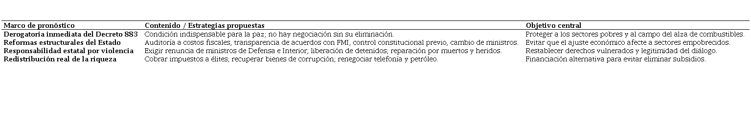 La auditoría a los acuerdos del Fondo Monetario Internacional, el cambio de ministros como ejes principales del diagnóstico del problema como déficit de transparencia y soberanía en la gestión pública. El pronóstico de control constitucional y ministerial demostró que el movimiento buscó incidir directamente en el ciclo de las políticas públicas (López Leyva, 2012), exigiendo que el estado garantizara que el ajuste económico no recaiga en poblaciones económicamente vulnerables.